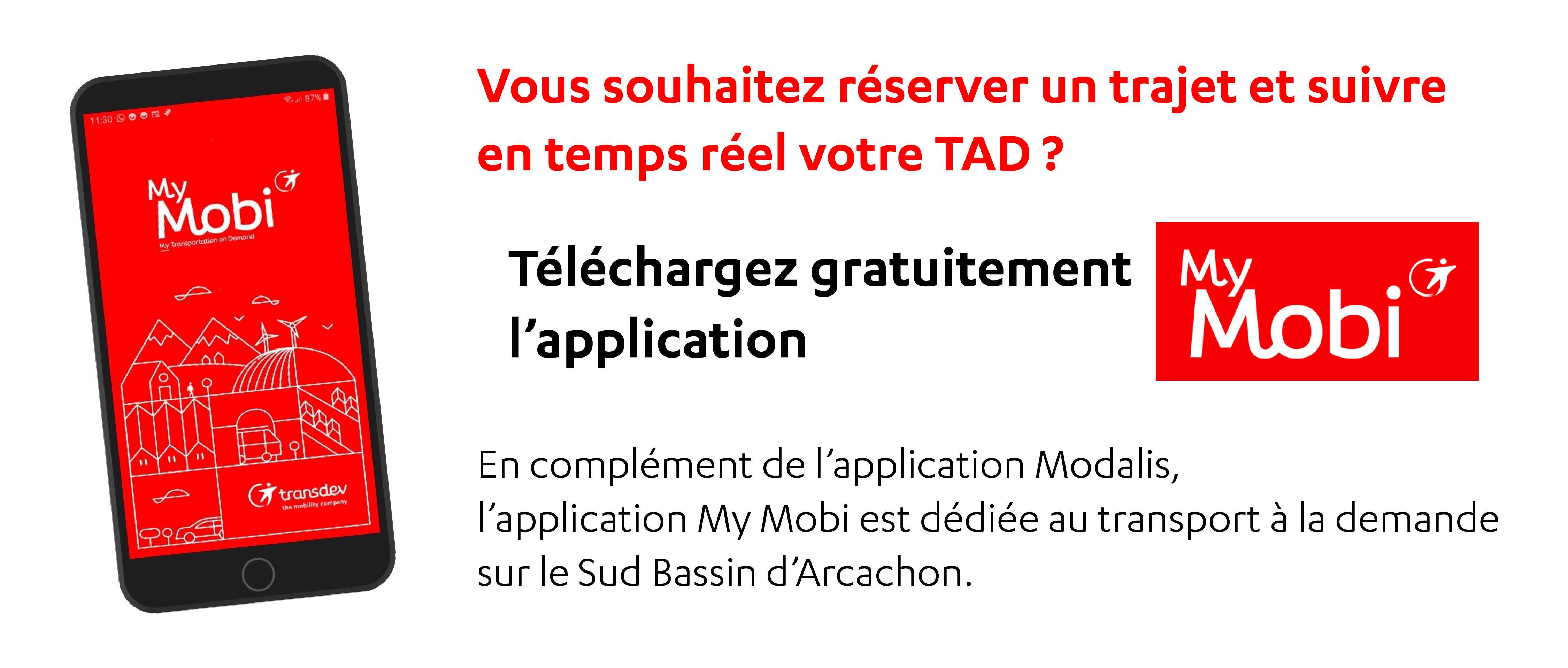 En complément de l'application mobile Modalis, découvrez l'application My Mobi, dédiée au Transport à la demande sur le Sud Bassin ! Une fois l'application My Mobi téléchargée, choisissez le réseau Bassin d'Arcachon. Cette application vous permet de réserver votre trajet, de suivre en temps réel le véhicule en approche et d'être averti en cas de retard. Voyagez en toute sérénité avec l'application My Mobi.